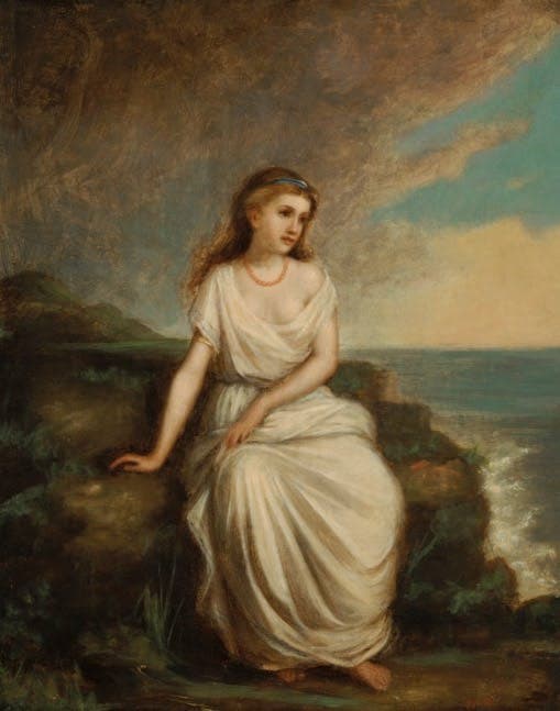 A very early painting by J.W. Waterhouse was auctioned in July 2023. Miranda (from William Shakespeare's play 'The Tempest') was a theme which Waterhouse returned to throughout his career.